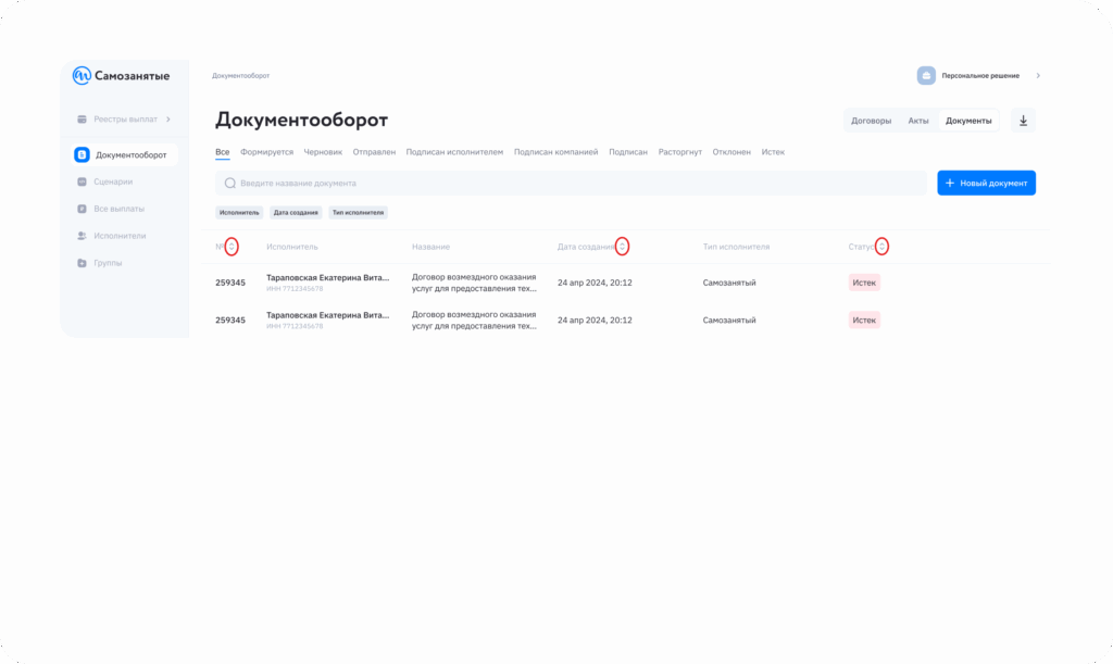Документы и договоры можно сортировать по номеру, дате создания и статусу.