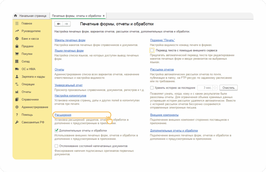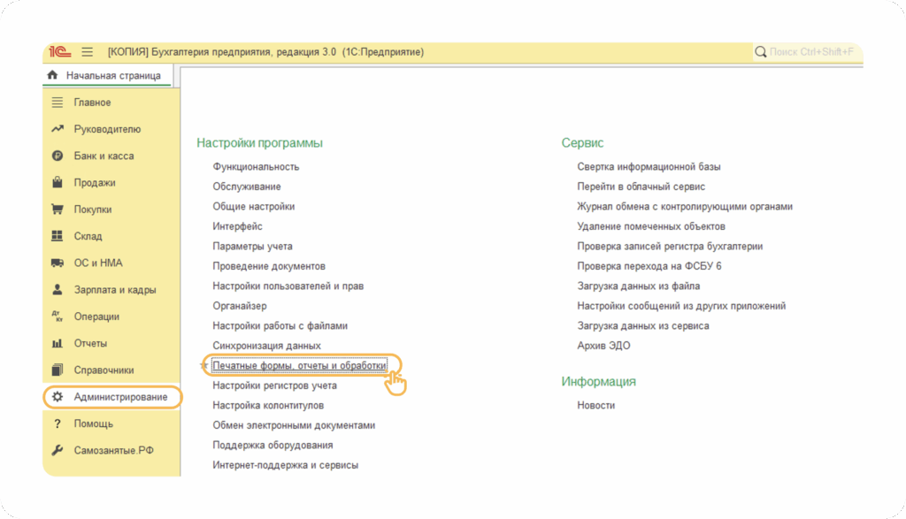 2. Перейдите в раздел «Администрирование» — «Печатные формы, отчеты и обработки».