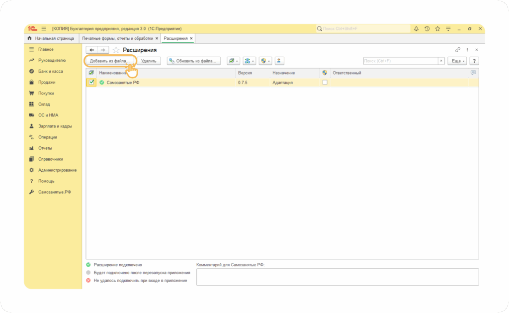 Готово! Модуль «Самозанятые.рф» успешно установлен в 1С.