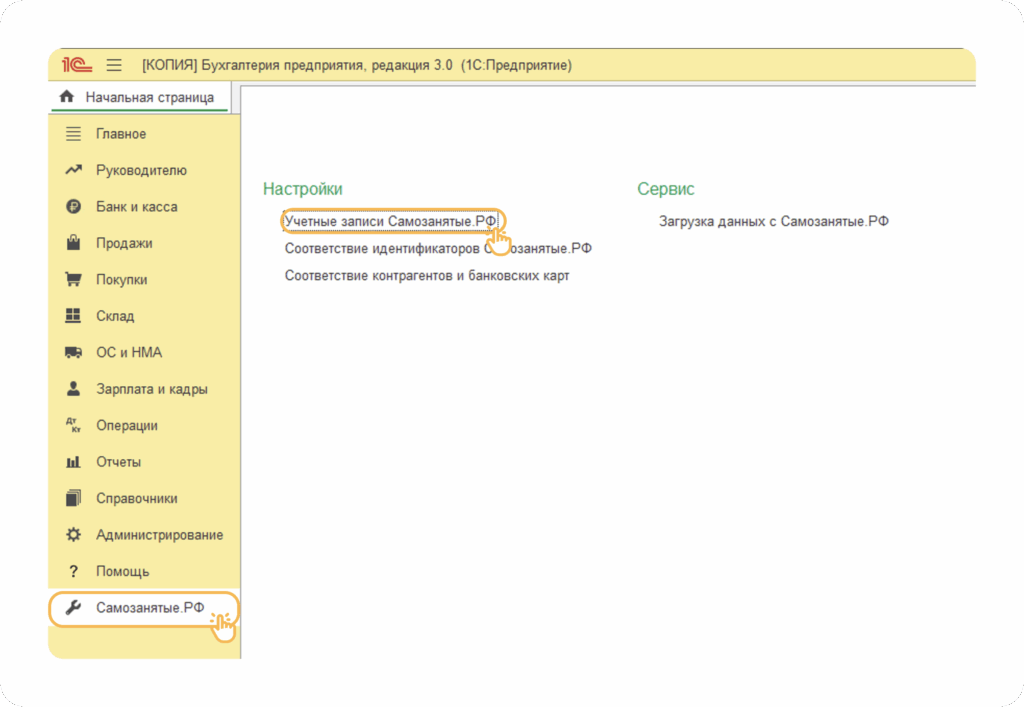 4. Перейдите в раздел «Самозанятые.рф» — «Настройки» — «Учетные записи Самозанятые.рф».