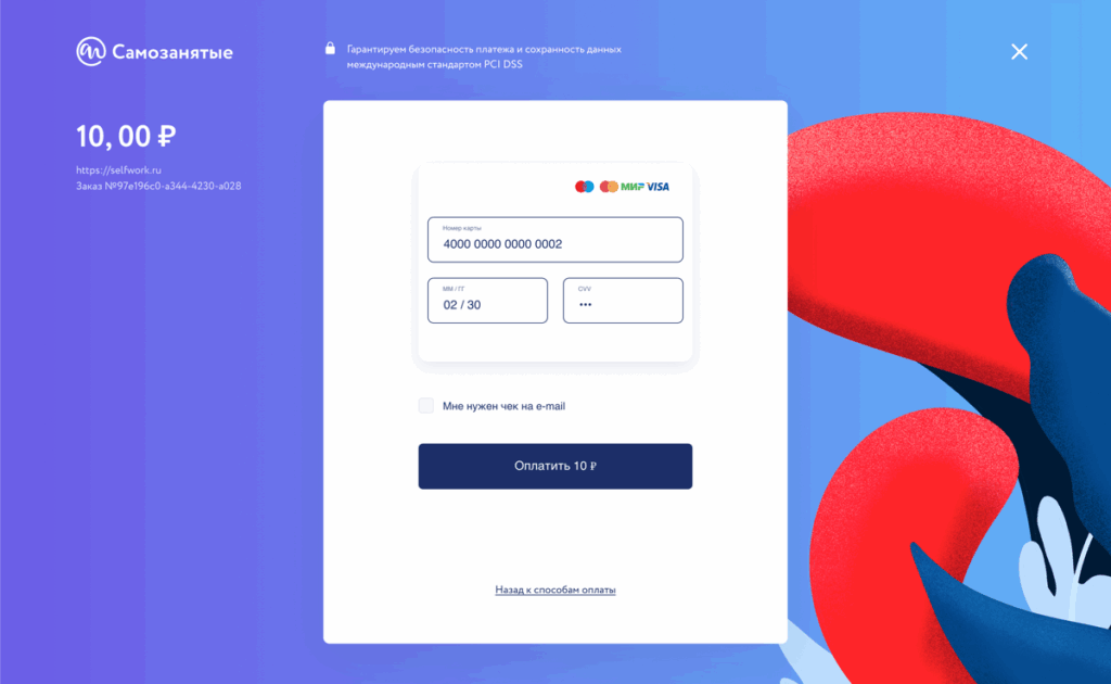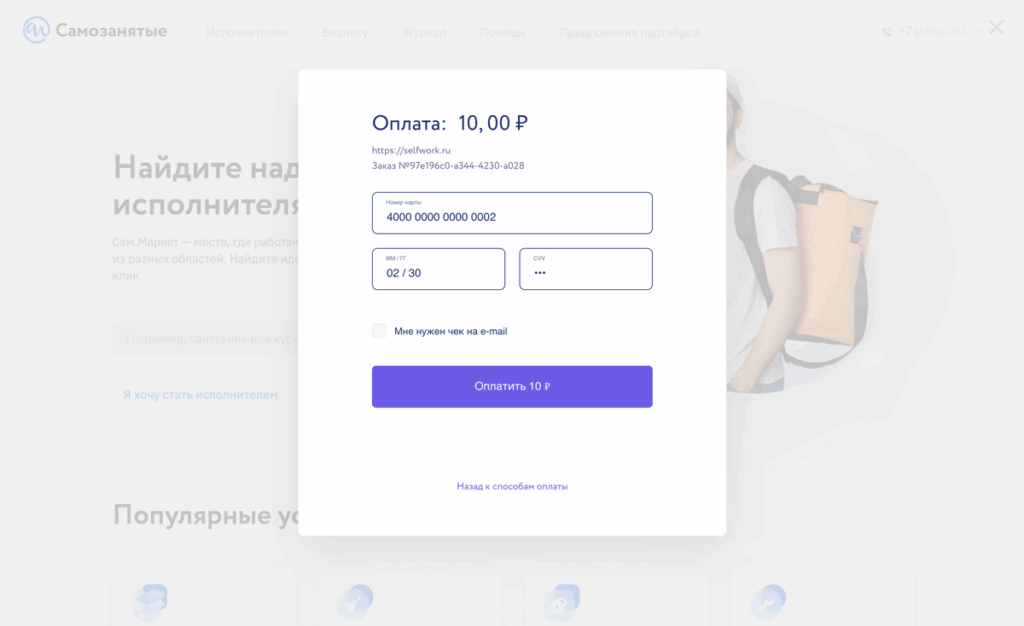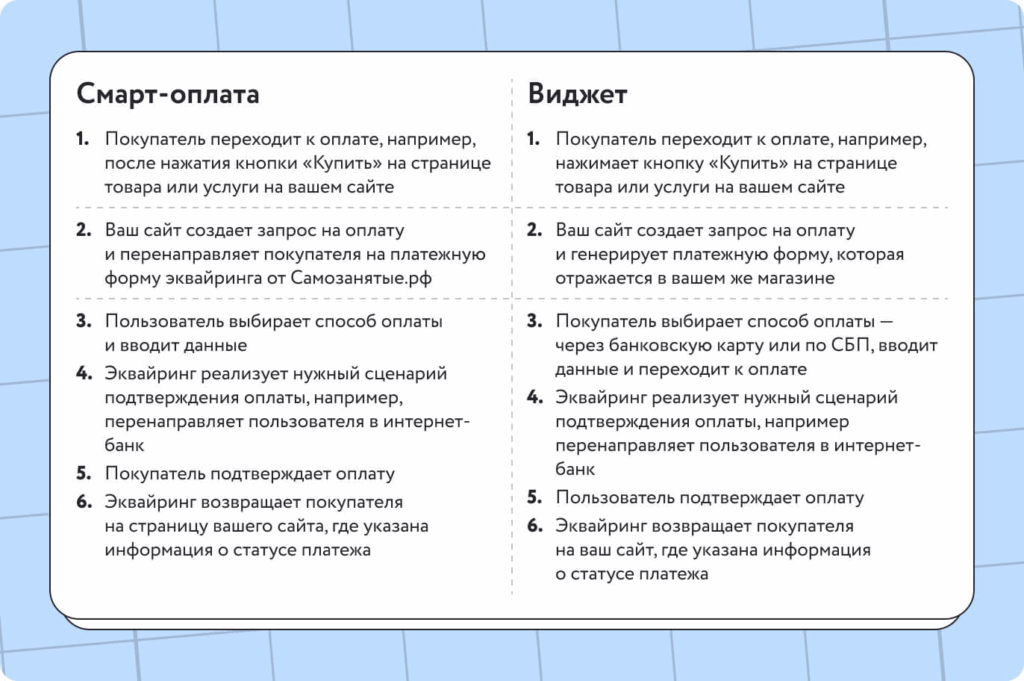 - Смарт-оплата — при оплате покупателя перенаправляют на страницу эквайринга от Самозанятые.рф.