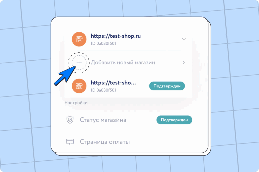 В новом окне вы увидите тестовый магазин — это пример того, как будут выглядеть операции в вашем магазине. - Чтобы добавить свой сайт, в верхнем левом углу нужно нажать на ссылку https://test-shop.ru и в выпадающем меню нажать «Добавить новый магазин».