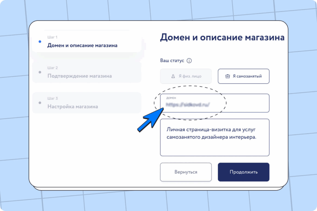 1. В открывшемся окне нужно указать свой правовой статус (самозанятый), адрес домена, краткую информацию о сайте:
