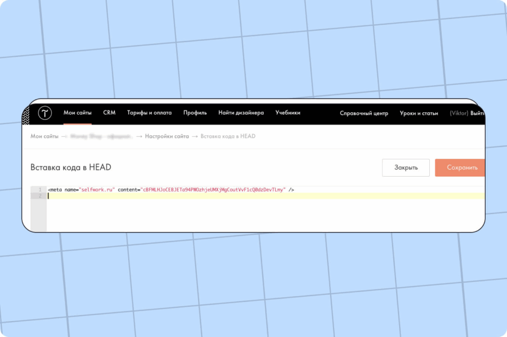 Выглядит этот путь так: на главной странице выбираете «Настройки сайта» → вкладка «Еще» → «HTML-код для вставки внутрь head» → «Редактировать код». Перед вами открывается готовое окошко, куда нужно вставить код: