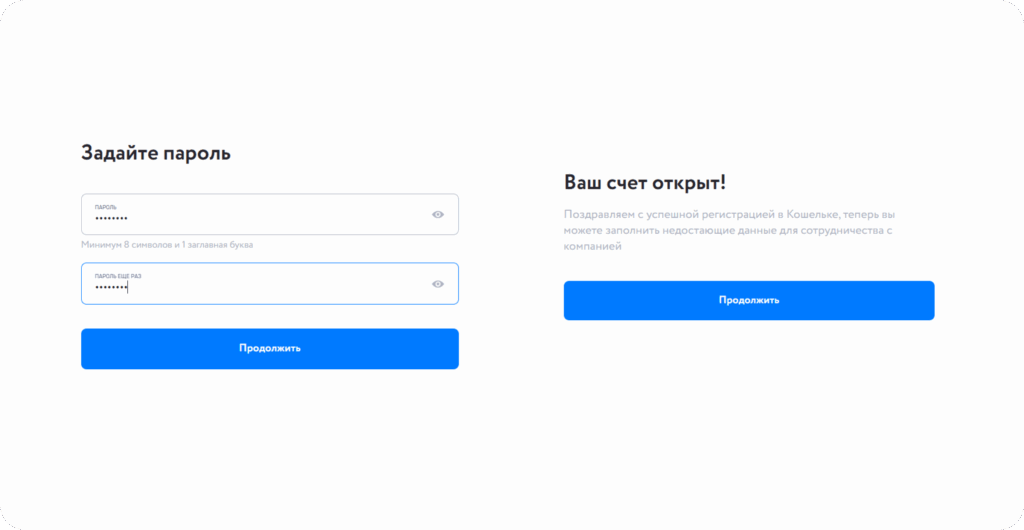 3. Придумайте пароль для входа в систему. Он должен содержать латинские буквы, из них одна – заглавная. Минимальная длина пароля — восемь символов. Теперь вы открыли счет в «Кошельке».