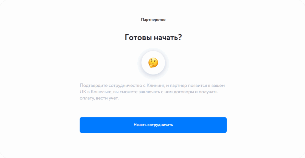 После окончания проверки вы автоматически перейдёте на следующий шаг — начало сотрудничества с компанией. Нажмите «Начать сотрудничать».