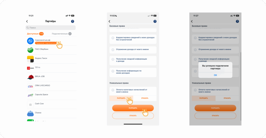 Среди списка партнеров появится «Самозанятые.рф», нажмите «Разрешить» — «Подтвердить».