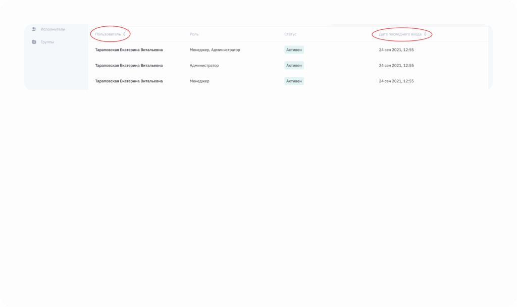 Вы можете отсортировать пользователей по ФИО и дате последнего входа, нажав на значок рядом с названием фильтра.