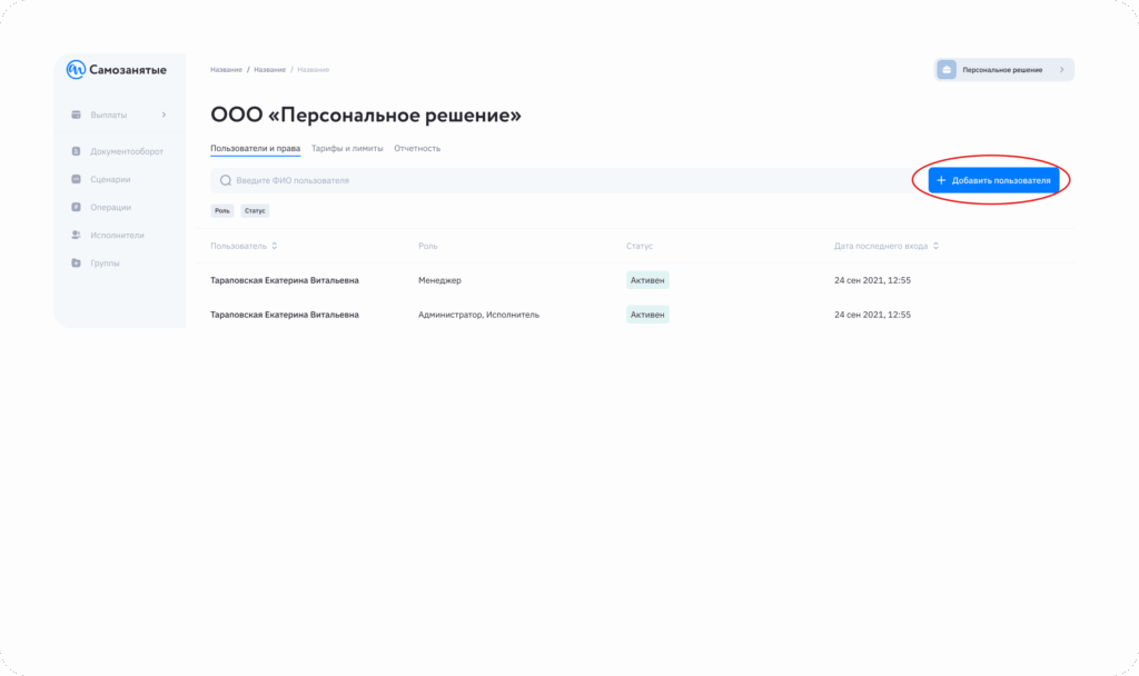 1. Нажмите кнопку «Добавить пользователя» в правом верхнем углу.