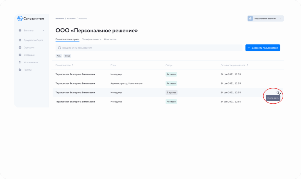3. Чтобы восстановить пользователя из архива, нужно найти его в списке (статус «В архиве») и нажать «Восстановить».