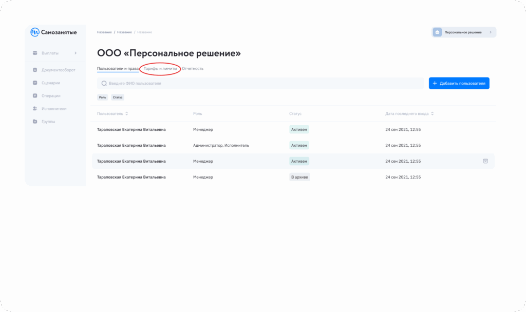 - Лимит по сумме операций на одного самозанятого — максимальная сумма одной выплаты и общую сумму выплат самозанятому за месяц.