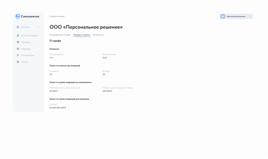 - Лимит по сумме операций для компании — какой общий месячный объем выплат по всем исполнителям доступен вашей организации