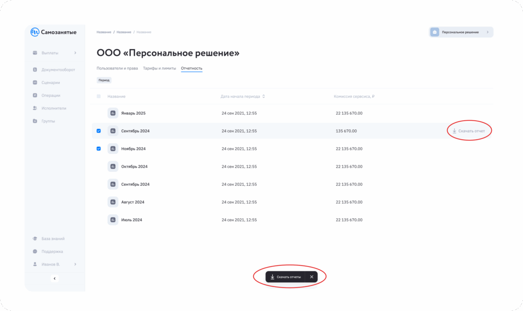На вкладке «Тарифы и лимиты» вы можете увидеть текущие комиссии и ограничения по операциям, а в разделе «Отчетность» — задать период и скачать готовые отчеты по одному или сразу несколько.