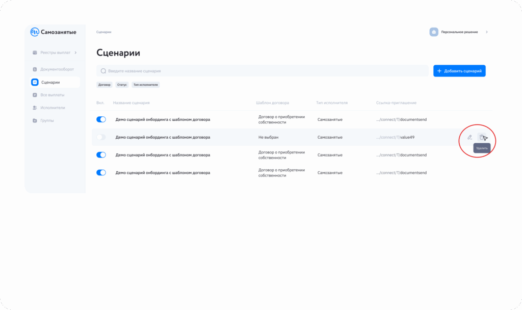 1. Нажмите иконку «Удалить» рядом с выбранным сценарием.