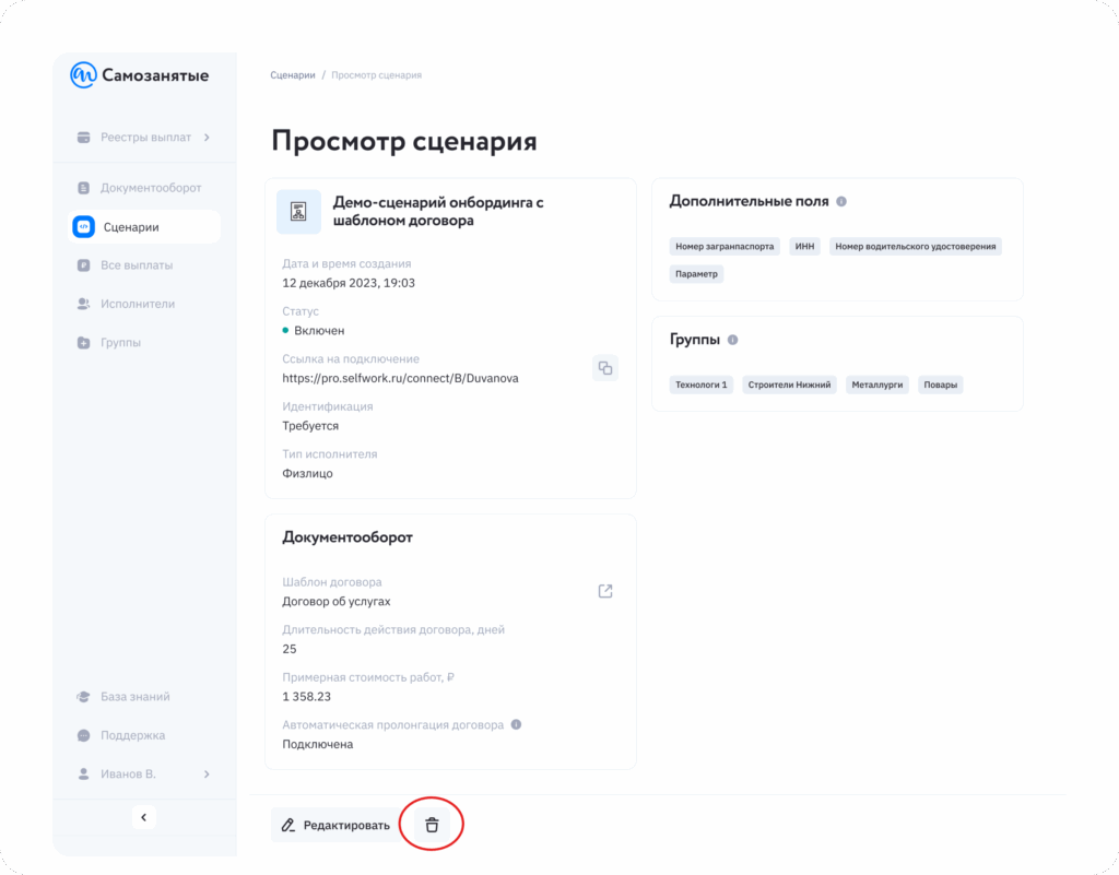 Если вы хотите удалить сценарий, нажмите на иконку корзины внизу страницы, а затем подтвердите действие.