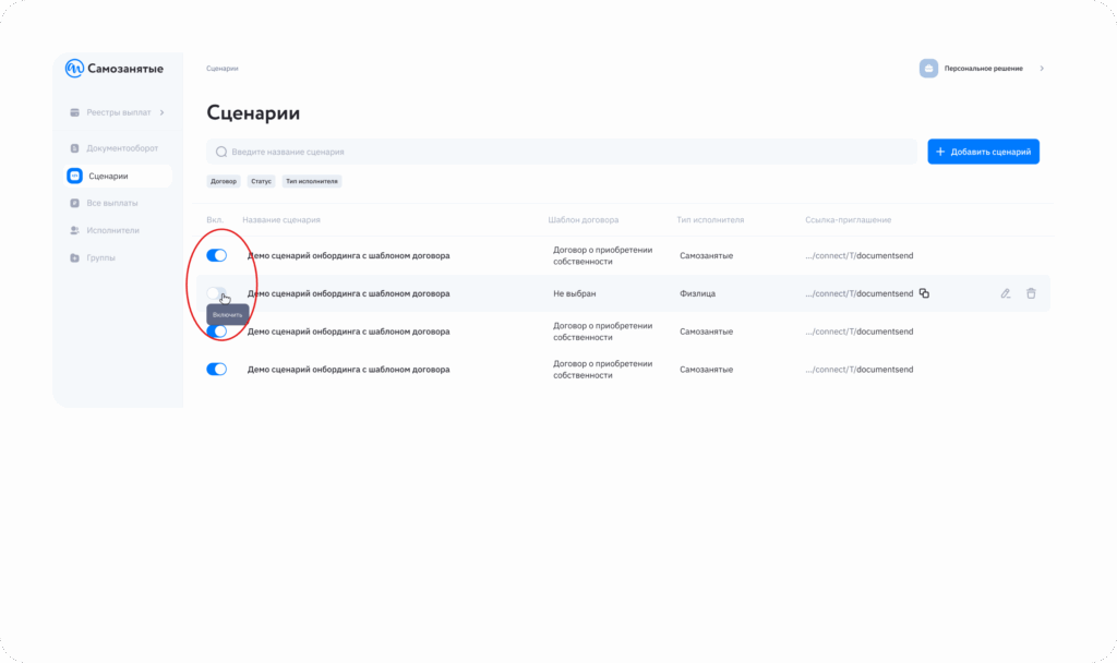 - Переключить влево (серый цвет), чтобы временно отключить сценарий. Исполнители не смогут подключиться по ссылке, если сценарий будет неактивен.