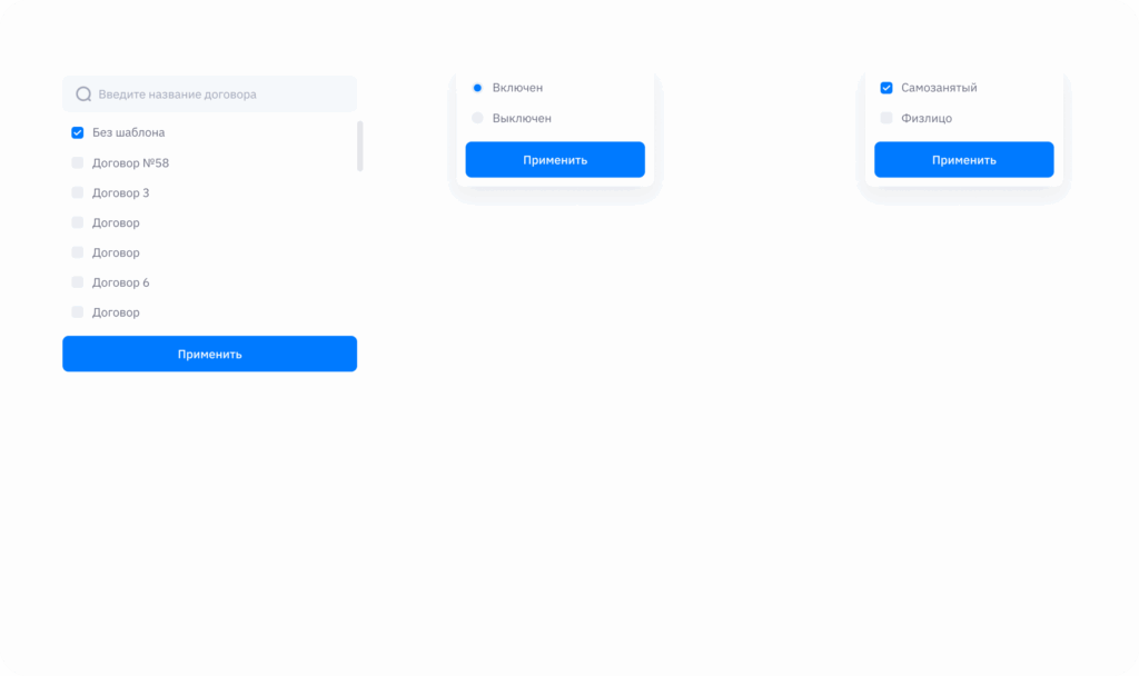 1. Нажмите кнопку с названием фильтра под поисковой строкой: «Договор», «Статус», «Тип исполнителя».