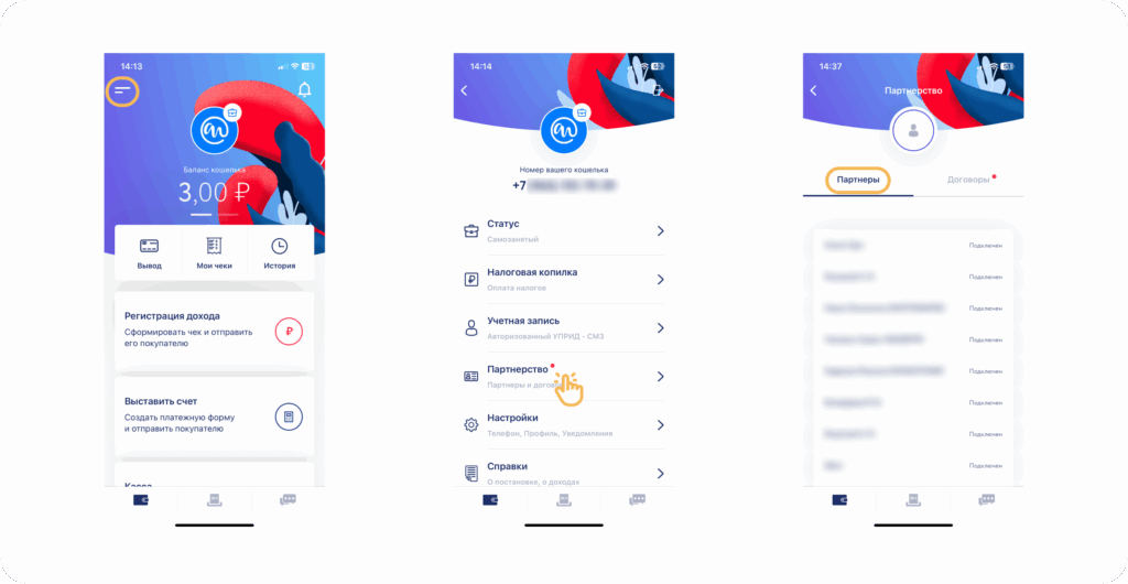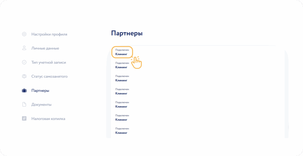 2. Перейдите в раздел «Партнерство», в списке партнеров нажмите на название компании, для которой нужно добавить карту.