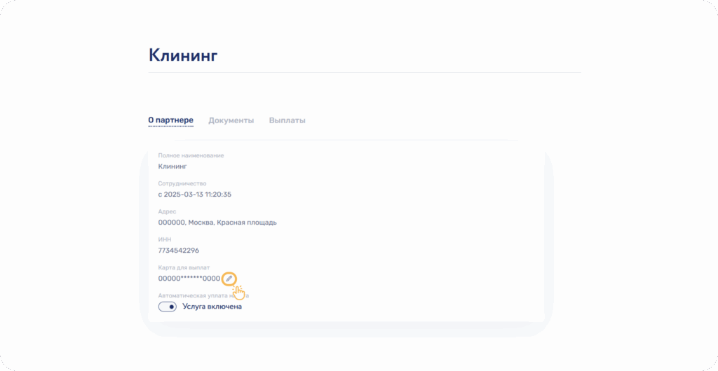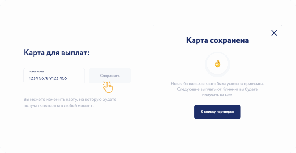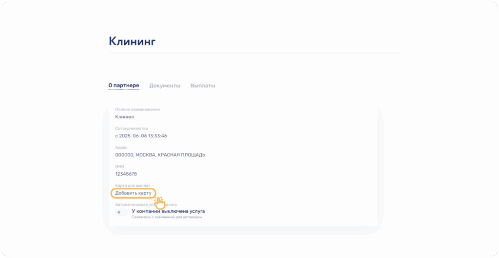 3. Нажмите «Добавить карту» в карточке партнера. Введите номер карты и нажмите «Сохранить».