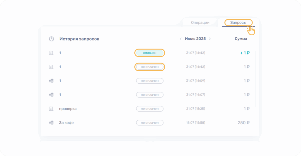 Посмотреть всю историю запросов, а также их статусы можно в разделе «История», во вкладке «Запросы». Там же можно найти время создания запроса, время оплаты и другую информацию.