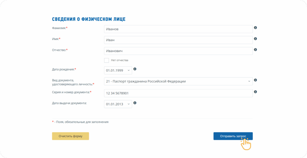 - заполните обязательные поля: фамилия, имя, отчество, дата рождения и паспортные данные.